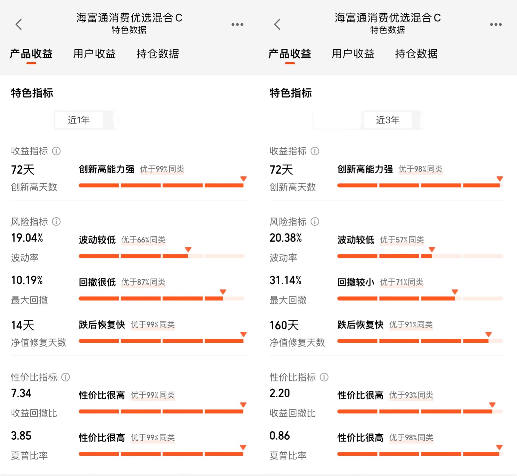 很多人只看收益,却忽略了风险。但在投资中,风险和收益是孪生兄弟,没有无风险的高收益,也没有无收益的低风险。海富通消费优选C最让我安心的一点,是它的风险调整后收益非常出色。近1年夏普比率3.85,优于99%的同类;近3年夏普比率0.86,优于98%的同类。