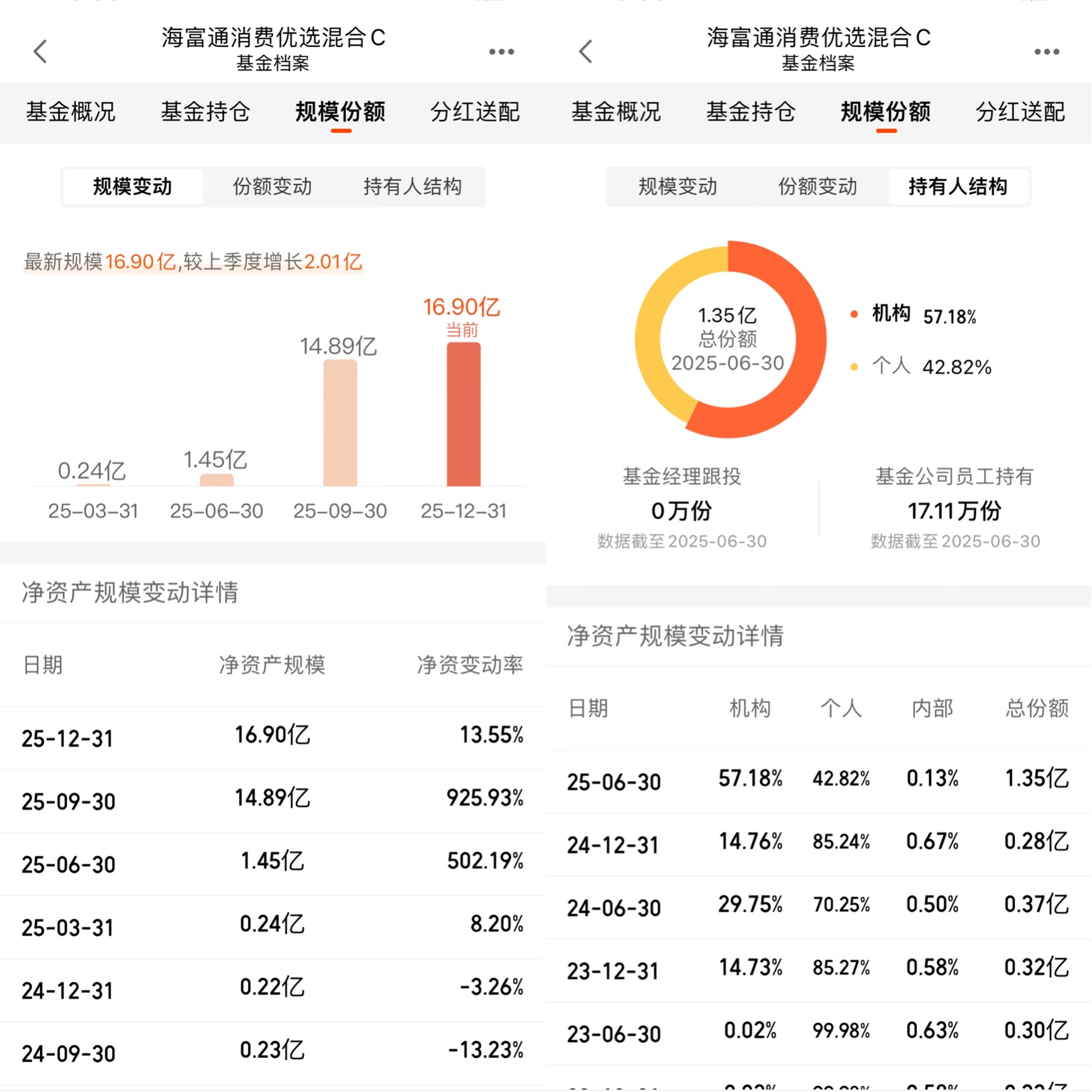 机构资金的涌入,对基金来说是好事也是坏事。好事是,机构投资者更理性,更看重长期业绩,不会轻易赎回,能为基金提供稳定的资金来源;坏事是,规模增长太快,可能会影响基金经理的操作灵活性。但从目前的情况来看,16.9亿的规模,对一只偏股混合基金来说,并不算大,反而处于“黄金区间”——既不会因为规模太小而面临清盘风险,也不会因为规模太大而难以调仓。