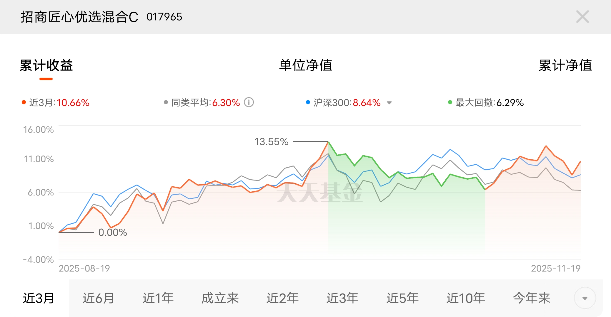 现在市场上稳健收益的基金越来越抢手,大家都想在控制风险的同时赚取收益。招商匠心优选混合C刚好满足需求,近3个月收益10.66%,稳稳当当赚钱,让理财更轻松。