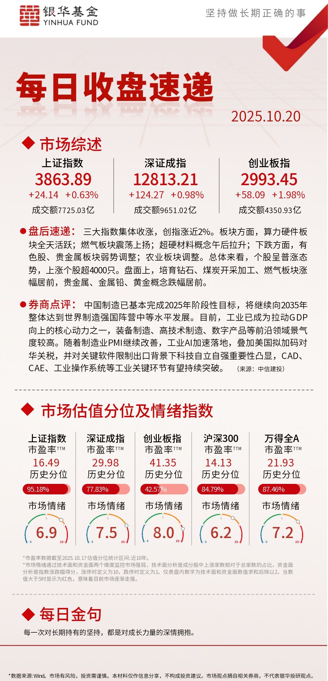 每日收盘速递 | 2025.10.20 三大指数集体收涨,创指收涨近2%