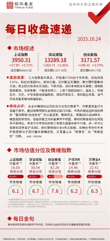 每日收盘速递 | 2025.10.24 三大指数高开高走,沪指涨0.71%创十年