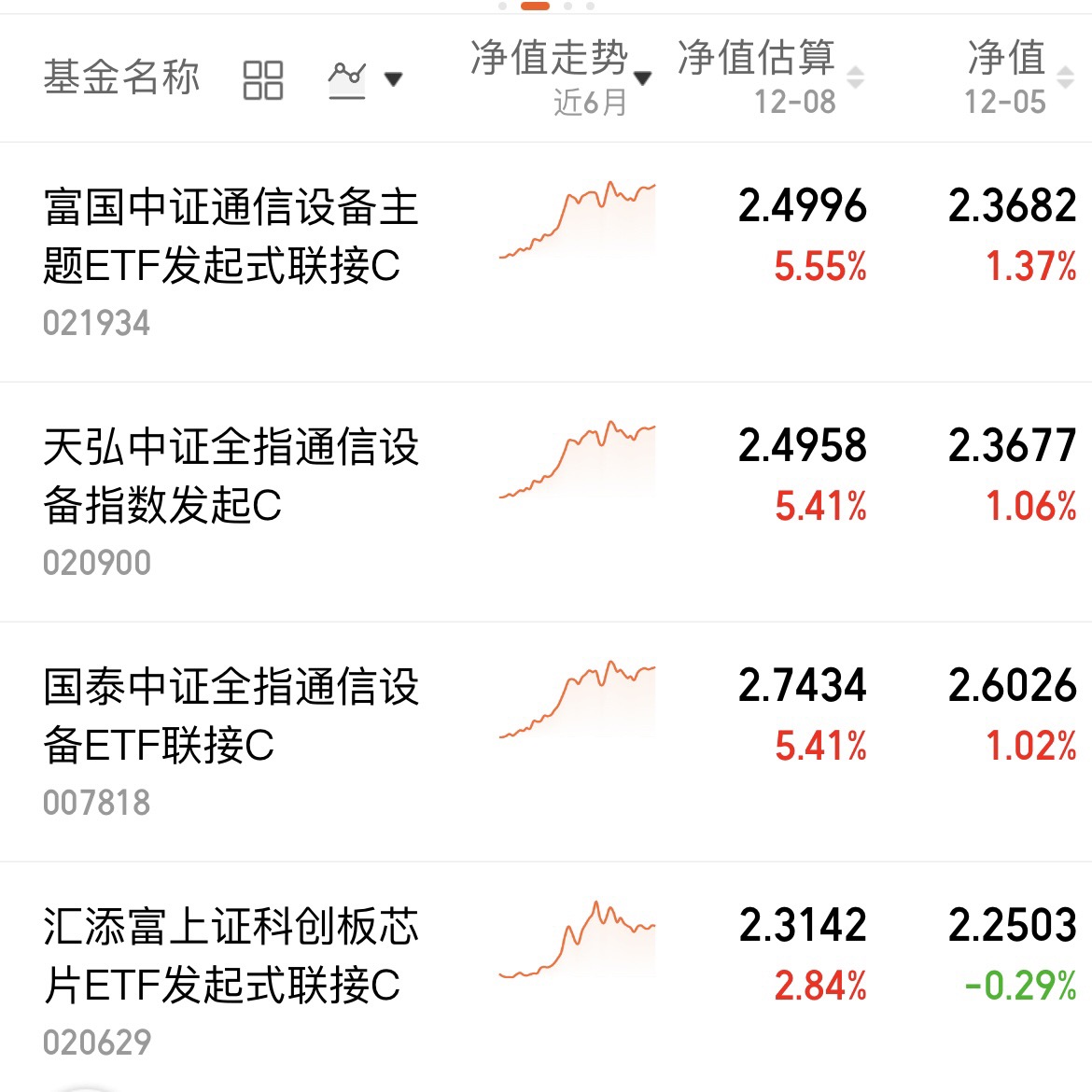 厉害,现在行情正火热呢,先定投科技吧,慢慢加筹码更稳当,来看看今天的估值吧$富国中证通信设备主题ETF发起式联接C$ 净值估算涨5.55%.$汇添富上证科创板芯片ETF发起式联接C$ 涨5.41%$国泰中证全指通信设备ETF联接C$ 涨5.41%