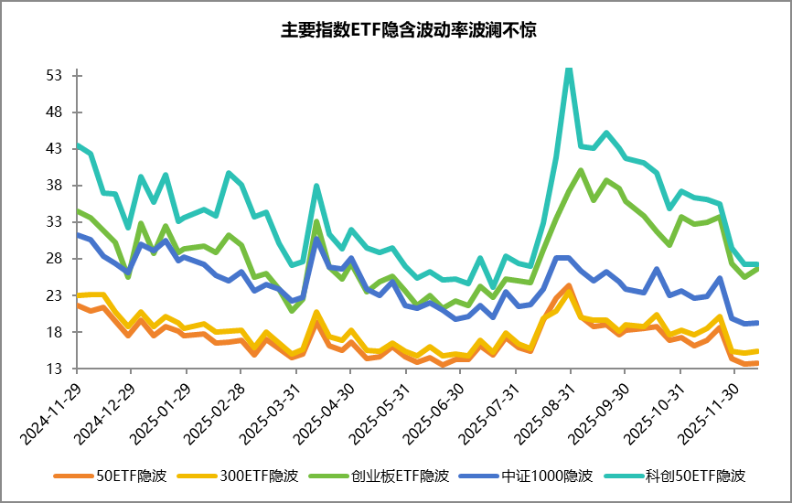在以上重要事件落地后,市场大体保持了平静,美联储降息并未对市场造成较大冲击,一方面与降息符合市场预期,另一方面美联储降息后发布会表述上并未进行预期管理,而国内中央经济工作会议后,市场整体震荡上行。但无论中美,市场的隐含波动率都有所下降,沪深300ETF隐含波动率在低位波澜不惊,或显示市场已经预期并消化了重要宏观事件的结果。同样海外市场美股的波动率也处于低位,VIX指数最新收盘14.85%。(wind,截至20251211)