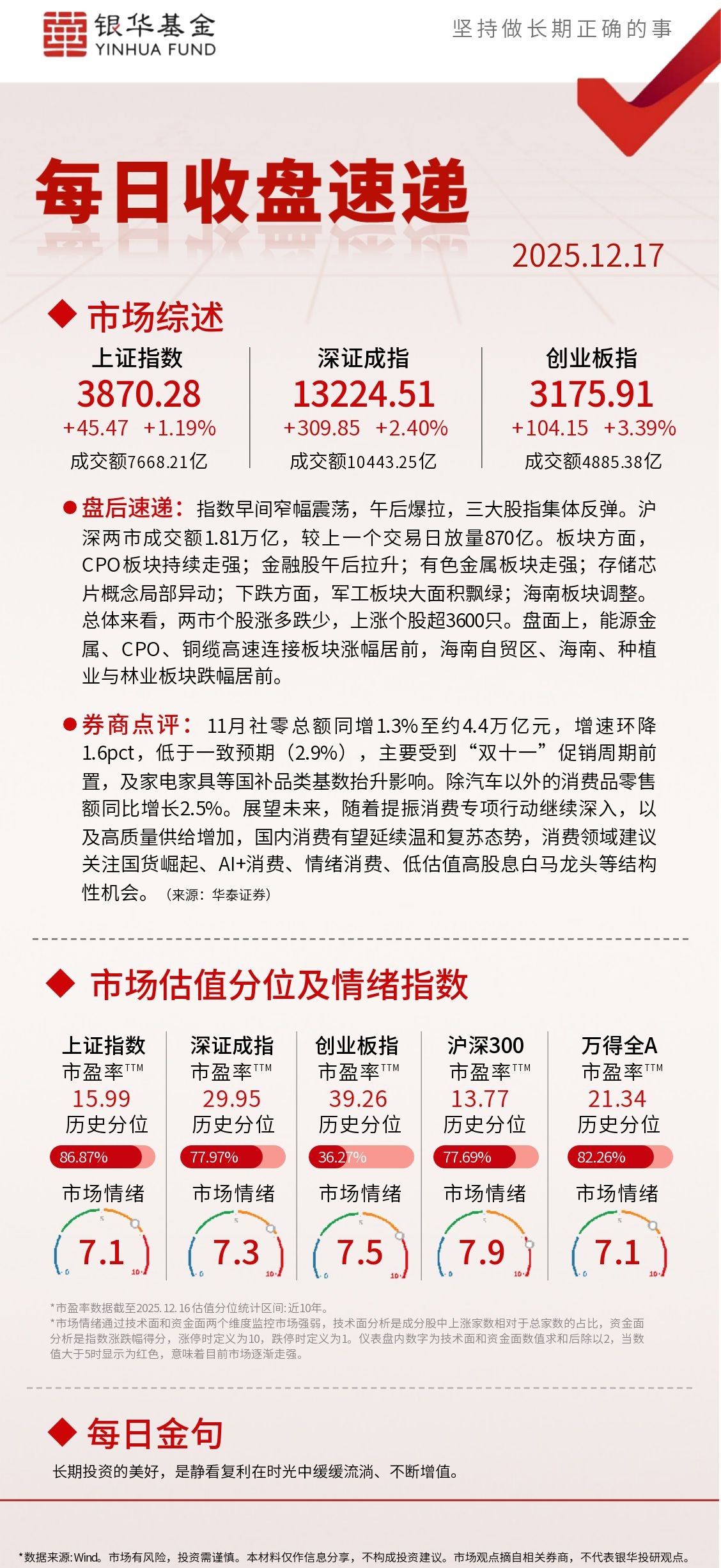 每日收盘速递 | 2025.12.17 创业板指放量大涨3.39%