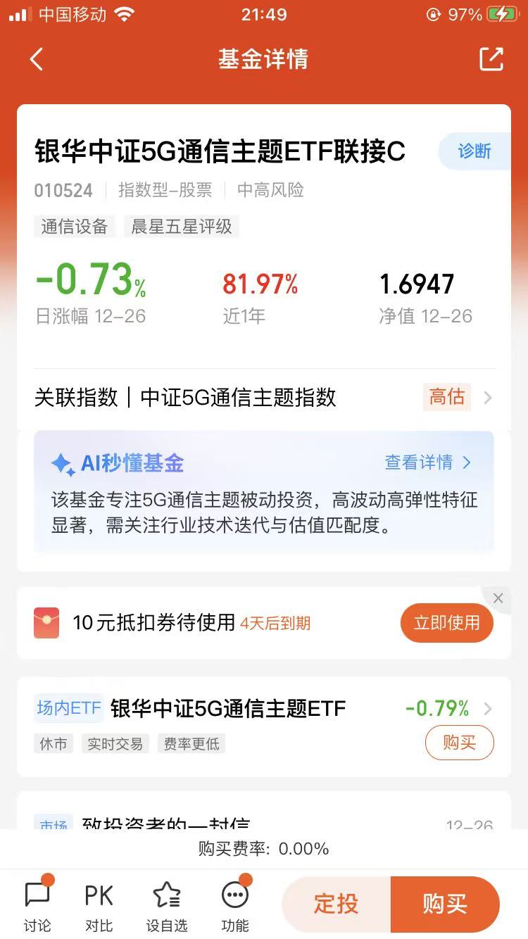 而关于我关注的$银华中证5G通信主题ETF联接C(OTCFUND|010524)$,结合自身投资体验和产品特性,我有这些看法。首先,它的核心优势在于低门槛和灵活性,作为场外联接基金,不用开通证券账户就能布局中证5G通信指数覆盖的全产业链标的,对于我这种没时间盯盘、也不擅长挑选个股的普通投资者来说,是便捷参与通信行业机会的工具。而且C类份额零申购费,持有满7天赎回费也为零,仅按日计提销售服务费,很适合我这种想灵活调整仓位、做短期波段或者小额定投的需求。