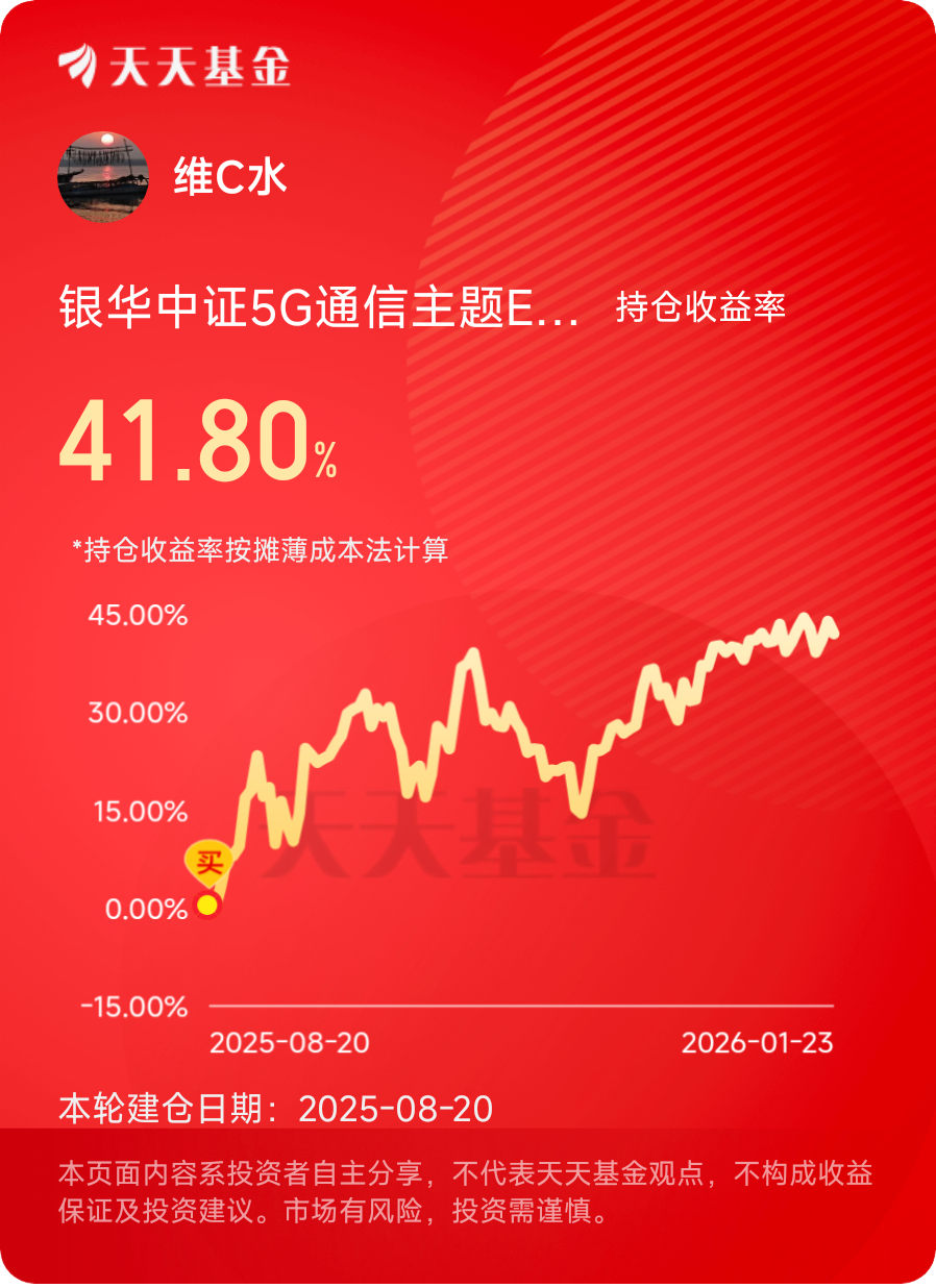 5G行业现在还在发展的黄金期,5G-A之后还有6G的研发,技术迭代不会停,产业落地也会越来越深。对于这只基金,我还是会继续拿着,定投也不会停,毕竟我始终觉得,国家的硬科技赛道,长期拿着肯定不会亏,而银华中证5G通信基金,就是普通人布局这个赛道最省心的方式之一。@银华基金