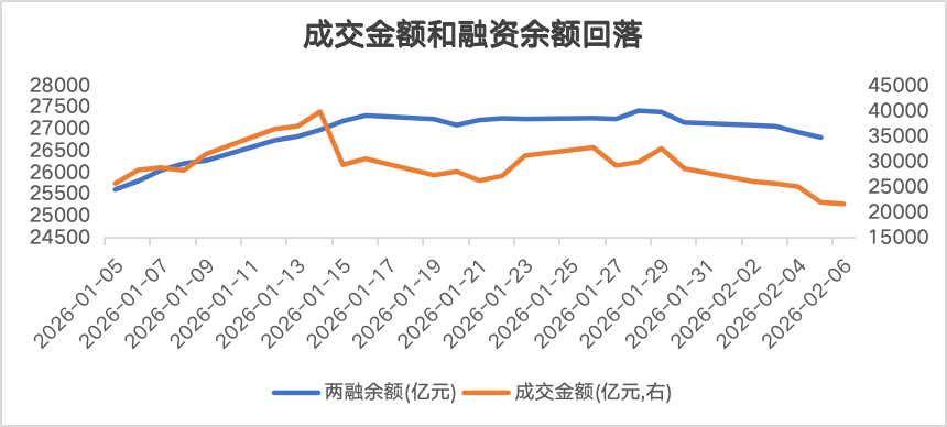 从资金层面观察,随着假期临近,市场交投活跃度有所下降,上周可以看出融资余额出现回落,而成交量相对此前也有所下落。今天沪深两市全天成交额达到2.25万亿,相比上周五放量,但整体仍不是特别亢奋的状态。(数据来源:Wind,下图区间为2026.1.1-2026.2.6,今天指2026.2.9)