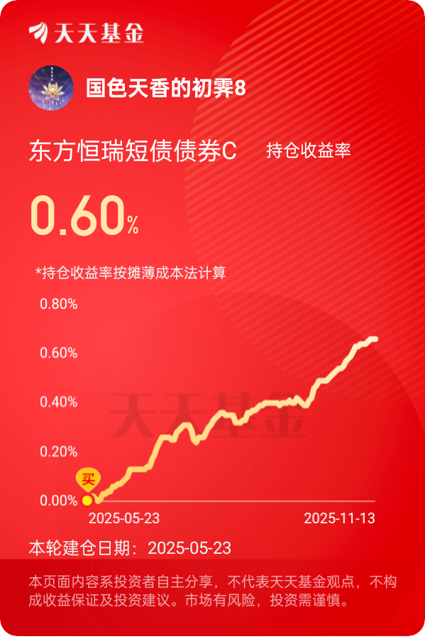 近期大盘新高后快速回落,主线方向暂不清晰,震荡格局下债基的稳健属性更适配当前市场。选择持有短债基,追求确定性收益,避开波动风险。$东方恒瑞短债债券C$ #晒收益#