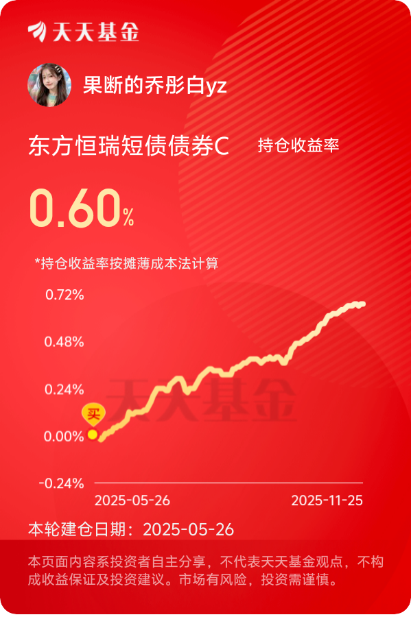 短债今天终于红了!调整完稳下来了,这低风险配置的性价比直接拉满,后面慢慢回血肯定稳~$东方恒瑞短债债券C$ #晒收益#