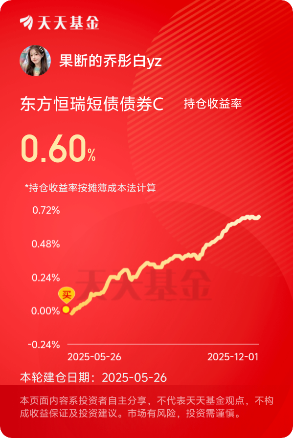 又是股债双杀的一天,临近过年钱包还在缩水,利率债小跌一口“重庆小碗面”,信用债倒是低等级比高等级抗打,就盼着短债能稳住,心累了,先躺平午休!$东方恒瑞短债债券C$ #晒收益#
