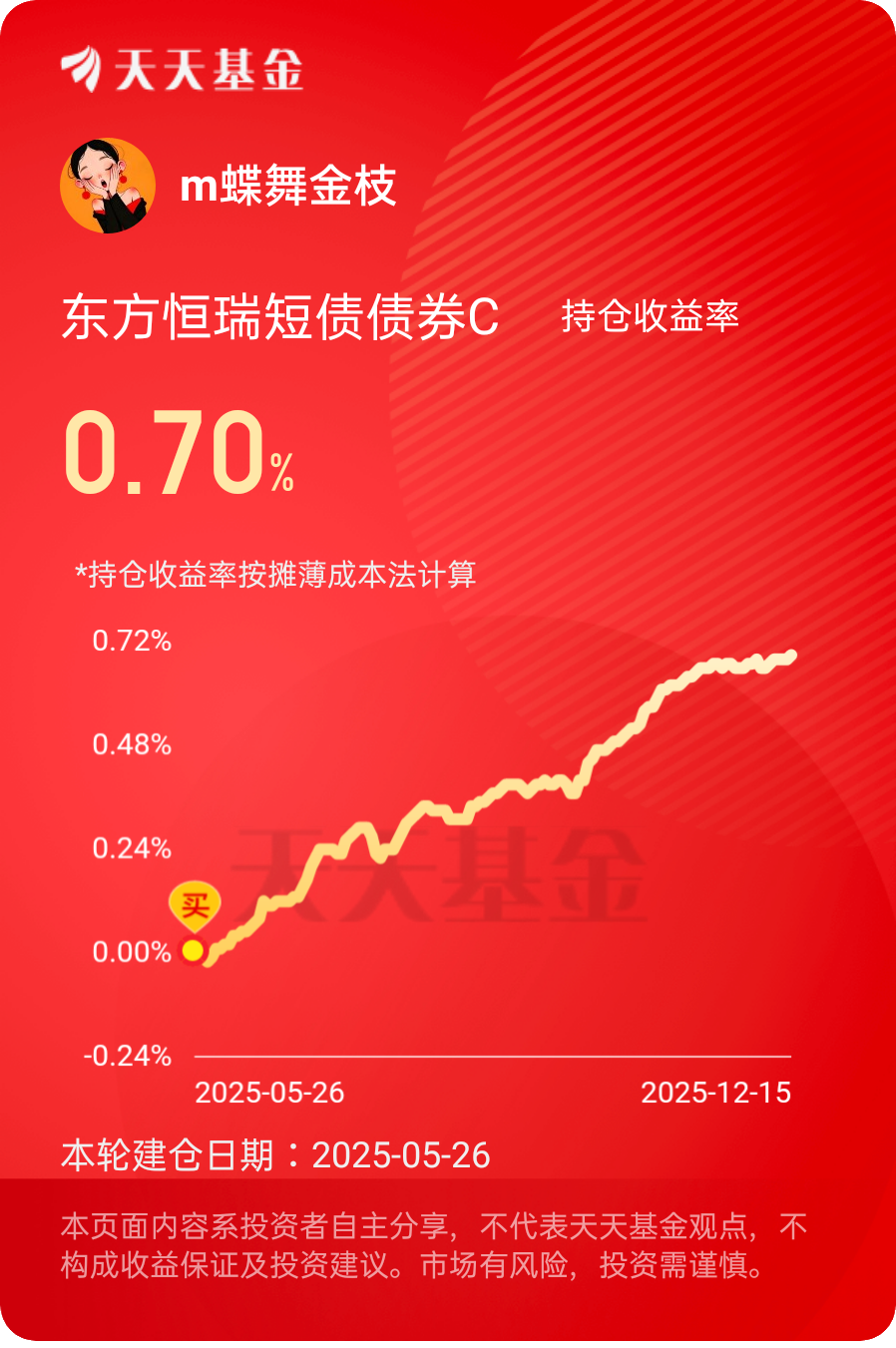 从产品特性来看,债基波动幅度远小于权益类基金,持仓性价比突出;今日利率债表现强势,午盘拉升进一步推动债市行情修复,后续可耐心等待市场趋势明朗。$东方恒瑞短债债券C$ #晒收益#