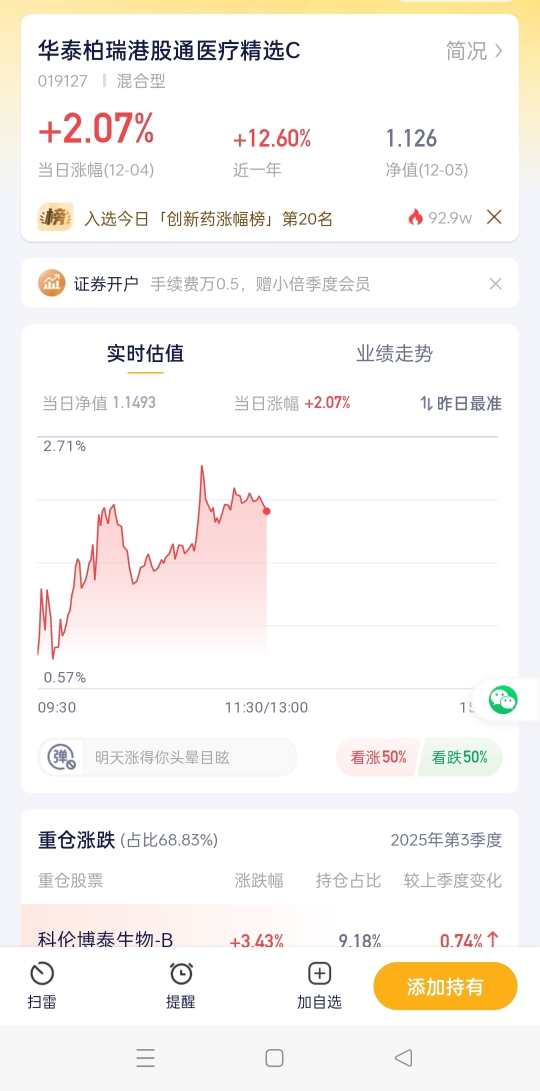 科技最近那行情看得人犯嘀咕,还是创新药让人踏实!今天一开盘创新药板块就红得发亮,实时走势一路往上蹦,连带着重仓的票都跟着涨。关键是现在创新药不光是表面涨,基本面硬、资金也在往里进,大家的情绪也跟着热起来了,这波走强是真靠谱。我直接入了华泰柏瑞,这基就盯着医疗创新这块,今天涨得也挺像样,趁这波机会先上车~$华泰柏瑞港股通医疗精选混合发起式C$ #12月你看好哪条投资主线?#