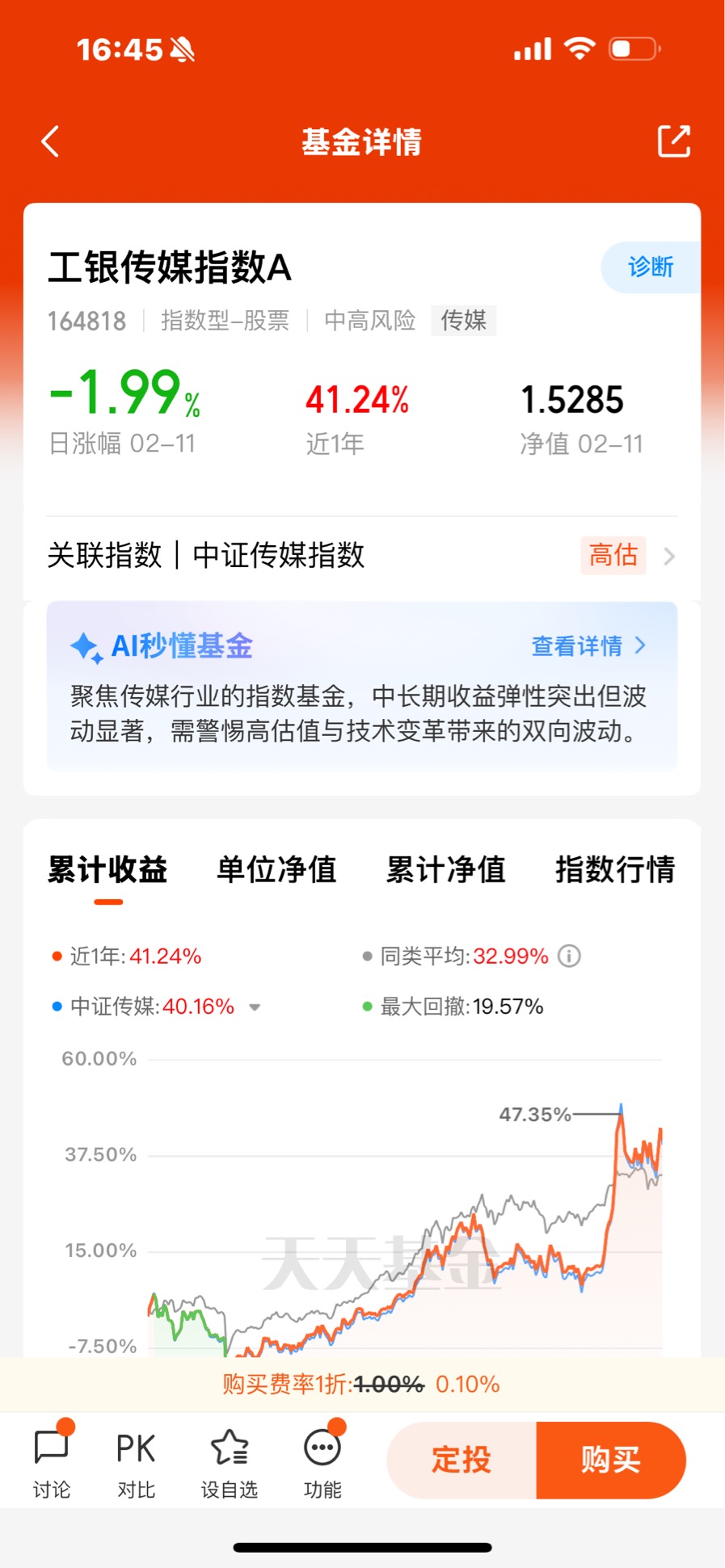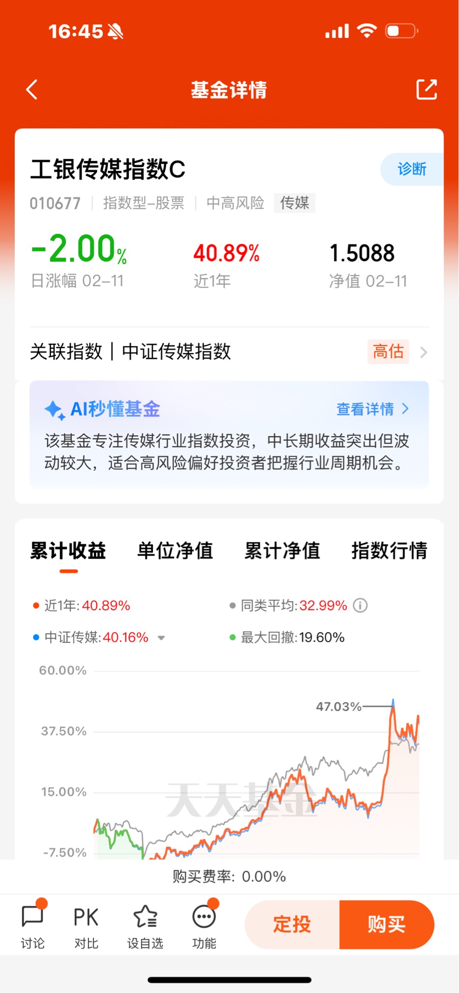 工银传媒指数C紧密跟踪中证传媒指数,覆盖游戏、影视、广告、院线等核心龙头,能充分享受板块整体上涨红利。
