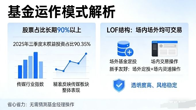 基金的运作模式也让我很放心,它保持高仓位运作,股票占比长期90%以上,2025年三季度末权益投资占比90.35%,能精准反映传媒板块整体表现,不会因为基金经理选股跑偏,完全贴合赛道行情。而且它是LOF结构,场内场外都能交易,平时用场外基金定投,行情好的时候场内灵活操作,新手也能轻松上手,透明度高、风格稳定,不用天天猜基金经理的操作,省心又省力。