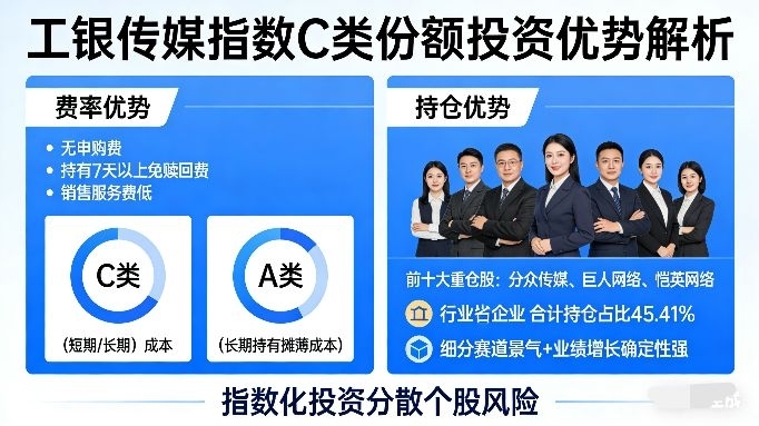 先聊大家最关心的费率,这对我们刚毕业、资金不多的新人太重要了!工银传媒指数C类份额,没有申购费,持有7天以上就免赎回费,销售服务费也很低,短期波段操作或者长期定投,成本都特别友好,不像A类需要长期持有才能摊薄成本,灵活度拉满,太适合我们新手试错、分批布局。再看持仓,前十大重仓股是分众传媒、巨人网络、恺英网络这些行业龙头,合计持仓占比45.41%,龙头企业受益于细分赛道景气,业绩增长确定性强,同时指数化投资又分散了个股风险,不用怕单只股票暴雷亏光本金,这对新人来说,安全感直接拉满。