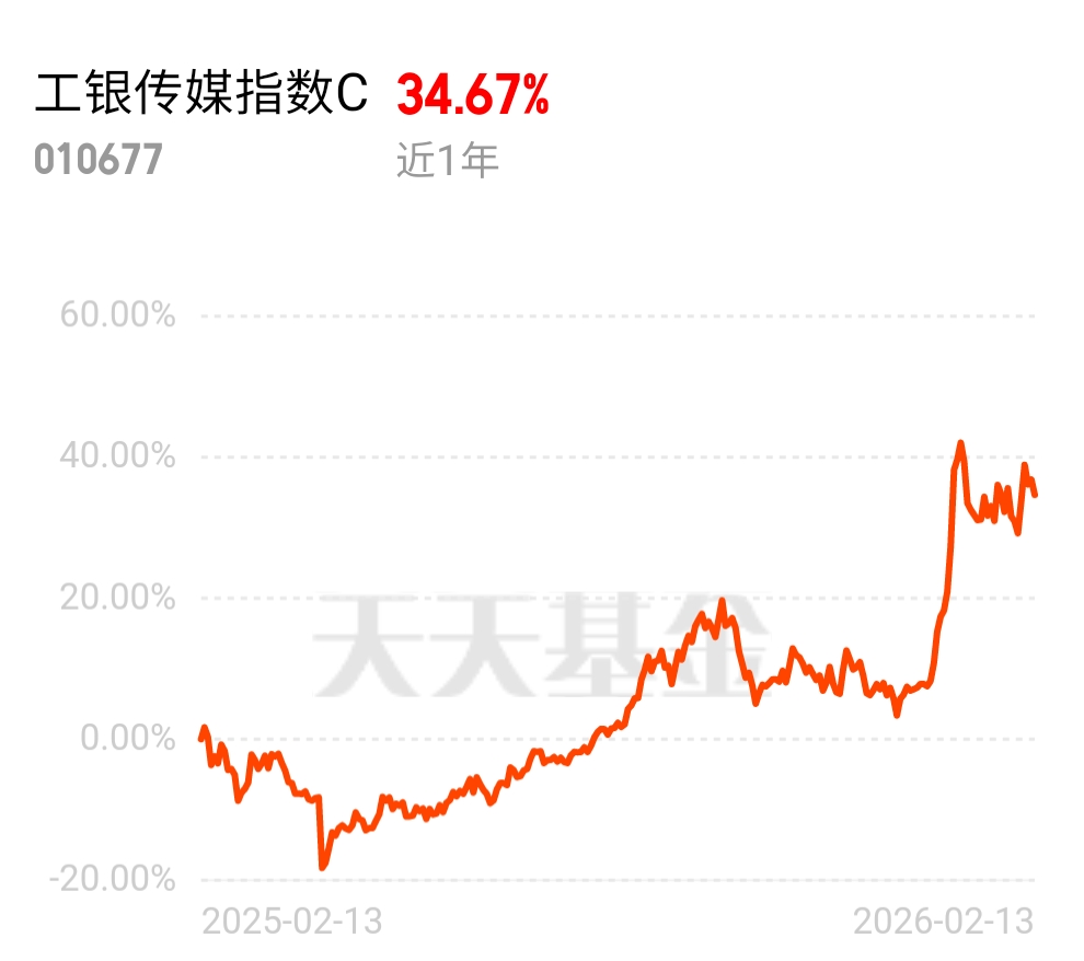 一键布局传媒板块,我正在密切关注:工银传媒指数(A类164818,C类010677,E类020407)。本基金采用被动指数化投资,紧密跟踪中证传媒指数,重点布局传媒、互联网等数字经济领域,受AI技术革新及内容消费升级驱动。近1年上涨了34.67%,今年短短的一个多月的时间里,更是上涨了21.54%,可见传媒板块迎来了上涨周期,爆发力超强!保持关注,年后择机上车!@工银瑞信基金