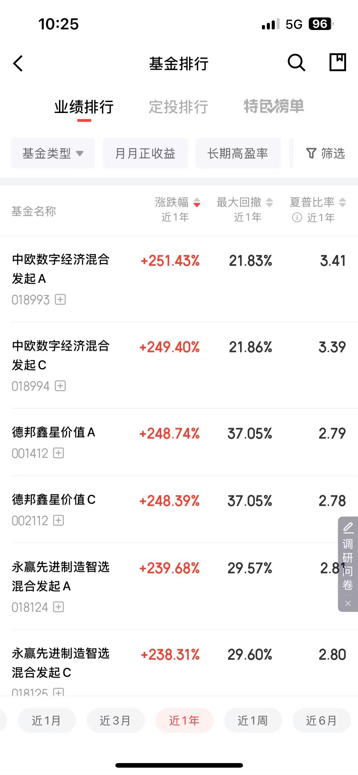 看看人家这收益,再看看自己账户,是不是有点扎心?$中欧数字经济混合发起C$(018994)近一年干了249%的涨幅,近一季也是87.42%的收益,稳稳的第一名,把信澳业绩驱动混合C(016371)远远甩在后面。冯经理的调仓能力确实强,能根据市场变化及时调整重心,比如从模型训练转到AI应用落地,这就叫专业。这基金虽然波动也有,但整体向上势头非常猛,近一年夏普比率5.94,表现优异,说明承担单位风险获得的回报很高。现在市场情绪正好,AI硬件、应用轮番表现,加上平台有红包活动,这时候不参与一下,难道要等风过去了再追吗?#指数操盘手集结令#
