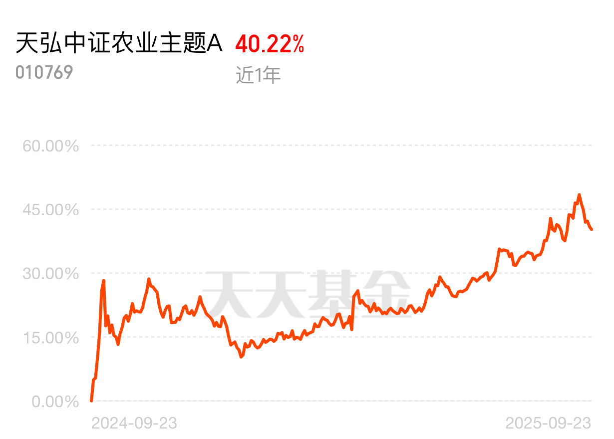 $天弘中证农业主题A$近一年(截至2025年9月)净值增长率为40%,在同类农业