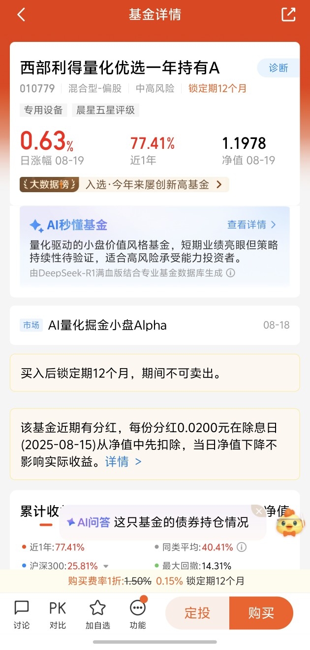 $西部利得量化优选一年持有A$ 今天单日上涨了0.63%,近一年的收益率高达77.41%,基金今天又分红了一次,也是今年第59次分红。投资性价比高。