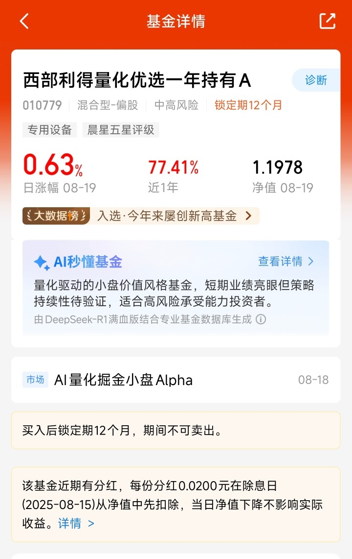 $西部利得量化优选一年持有A$ 今天单日上涨了0.63%,近一年的收益率为77.41%。回撤小、也是一个能涨抗跌的优质基金。
