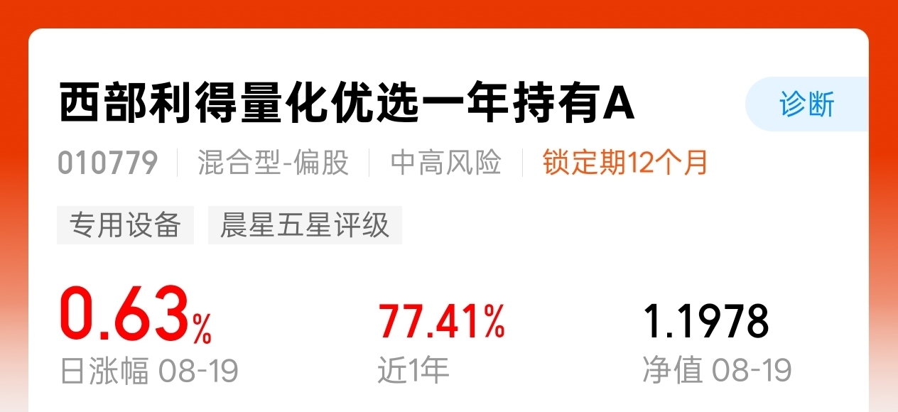 $西部利得量化优选一年持有A$ 今天涨了0.63%,近一年涨了77.41%,量化策略不错。