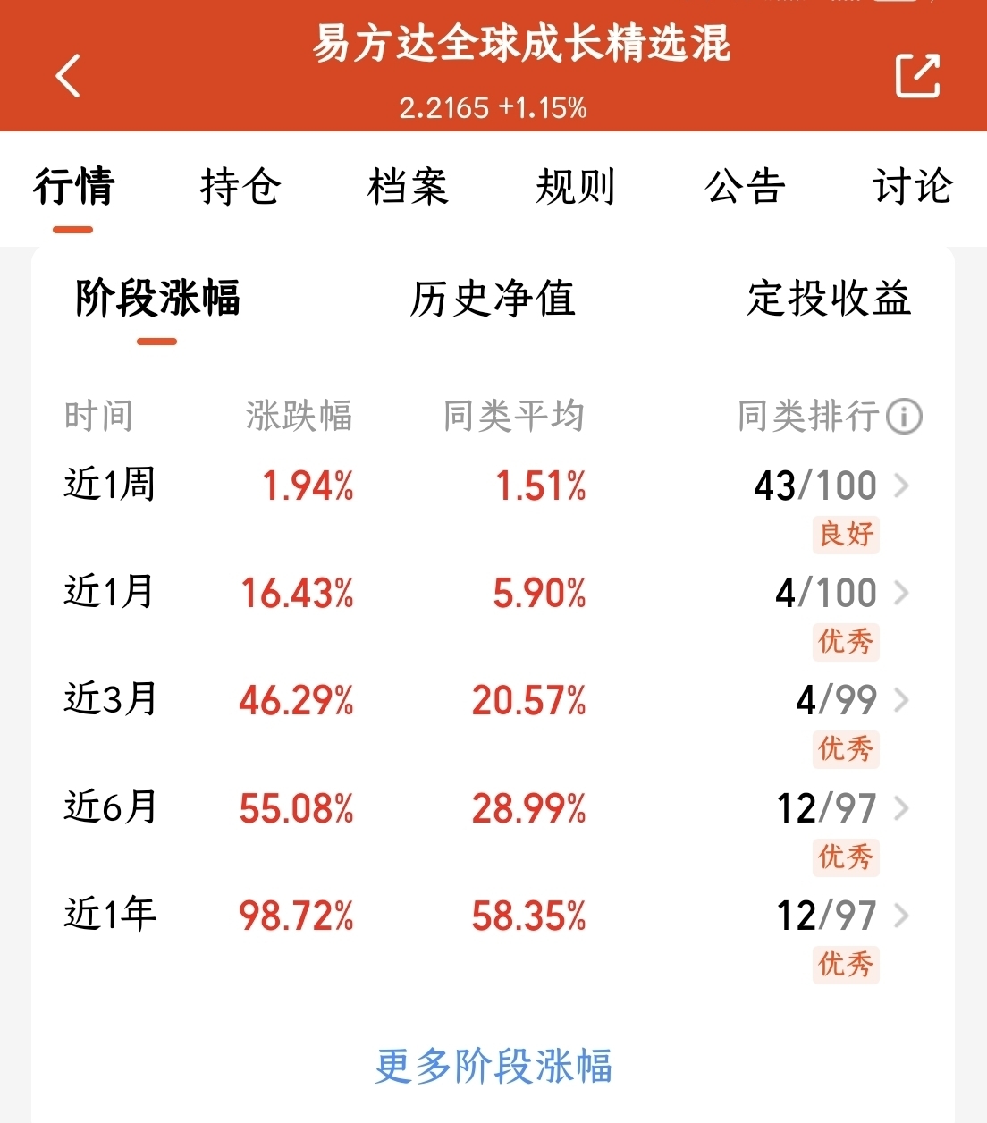 $易方达全球成长精选混合(QDII)人民币C$ 这款全球科技投资产品凭借稀缺的跨市场布局脱颖而出,可在A股、港股、美股间灵活切换,有效规避单一市场风险。基金经理展现出卓越的择时能力,一季度精准加仓港股捕捉估值修复,二季度转战美股AI算力赛道,近期又通过及时调仓控制回撤。其管理的易方达全球成长精选产品季报显示,每次调仓都与市场趋势高度契合,验证了精准预判实力。当前全球科技板块经历回调,正是布局良机。产品独有的全球配置优势,配合基金经理高超的调仓能力,既能把握各地科技成长机遇,又能规避高位风险,是布局科技赛道不错的选择!