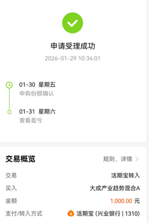 以上的长期业绩足以证明,韩创近期的业绩,绝非一时的运气。谁能有连续7年多的好运呢?业绩这么牛的基金经理,怎么着今天也得买一点,我先买入1000元大成产业趋势混合A(010826),后续逢调整再逐步加仓。