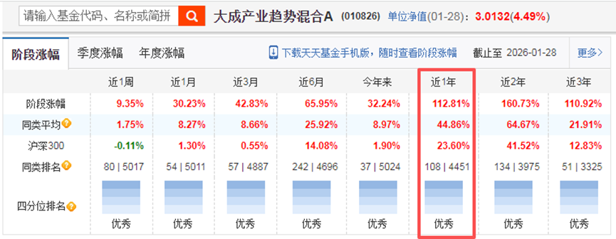 大成产业趋势混合A(010826),近一年收益率112.81%,是沪深300指数同期收益率23.6%的近5倍,业绩太牛了。