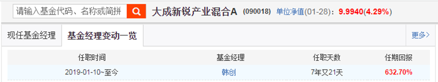 我查了一下韩创管理的全部基金,找出他管理时间最长的那一只,也算是他的成名作,大成新锐产业混合(090018):在其任期7年21天的业绩是632.70%,这个业绩强得可怕,简直让人不敢相信!经再三确认,我才不得相信,这个业绩是真的。