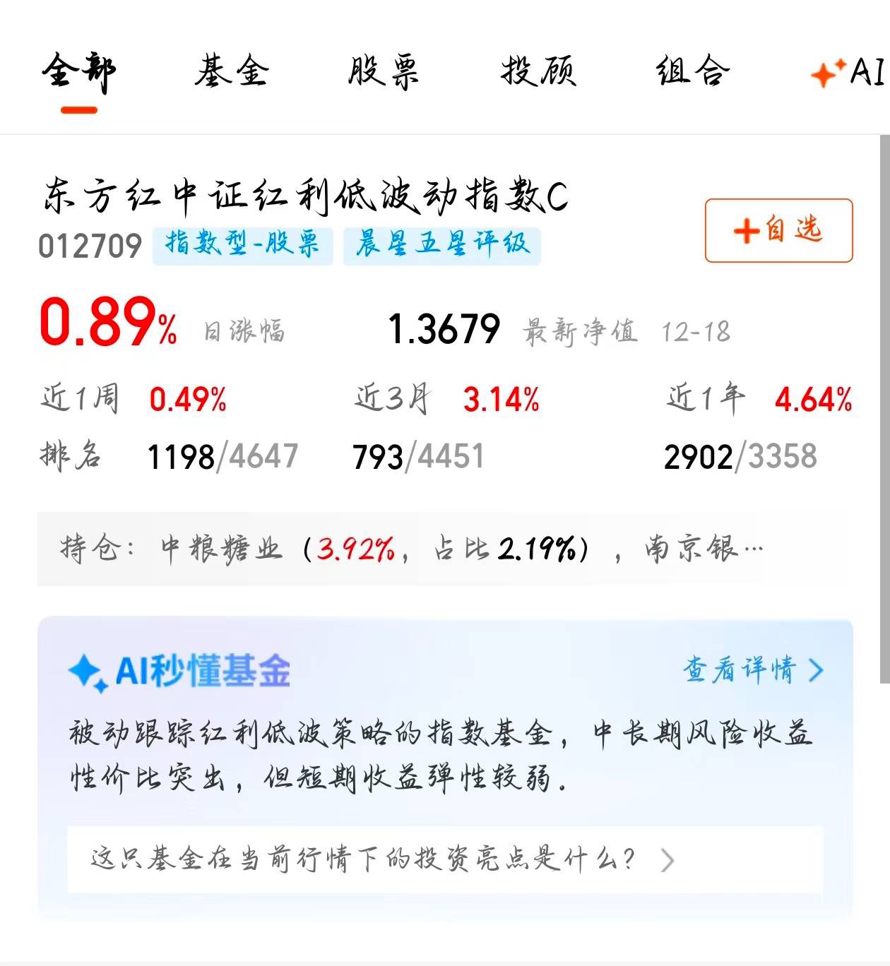 东方红红利低波的分红虽然不多但很实在,近一年和三年的收益也很给力,红利策略在震荡市里确实有用,我会一直拿住不轻易卖出。