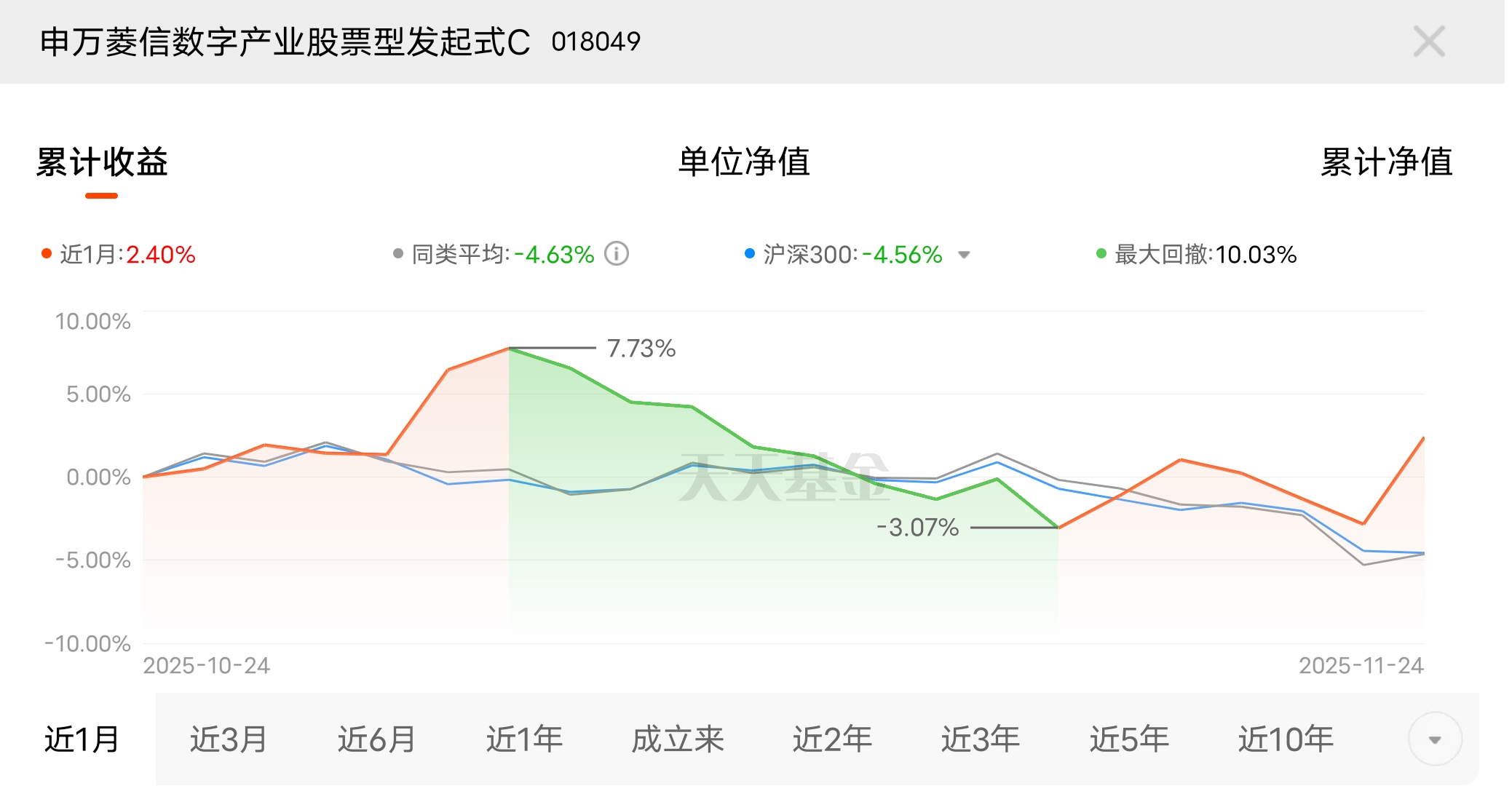 数字产业成为市场投资新风向,技术进步+政策支持双重利好,行情持续向好,申万菱信数字产业近1个月涨2.40%,贴合当下市场热点,想布局的可以抓紧时间。