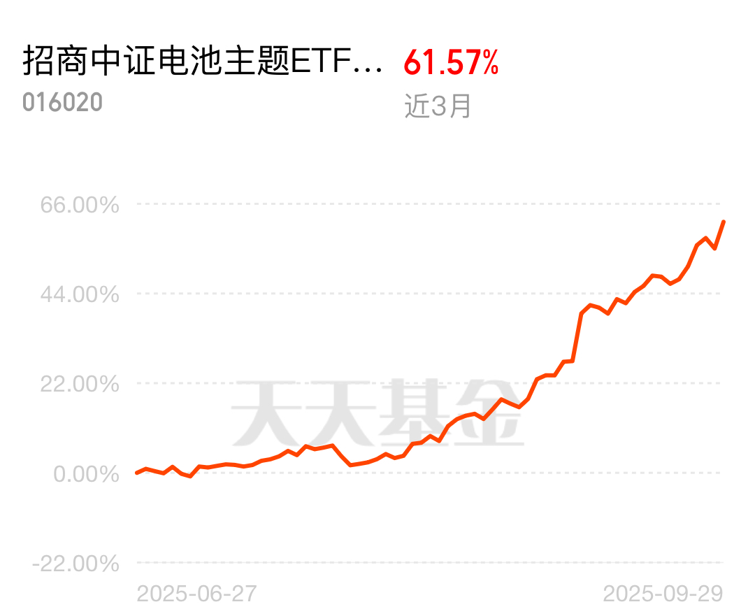 电池板块昨天行情火热,今天指数往上走。指数覆盖动力、消费电池领域,还有固态电池股,招商中证电池主题ETF联接C近3个月61.57%,业绩很能打。