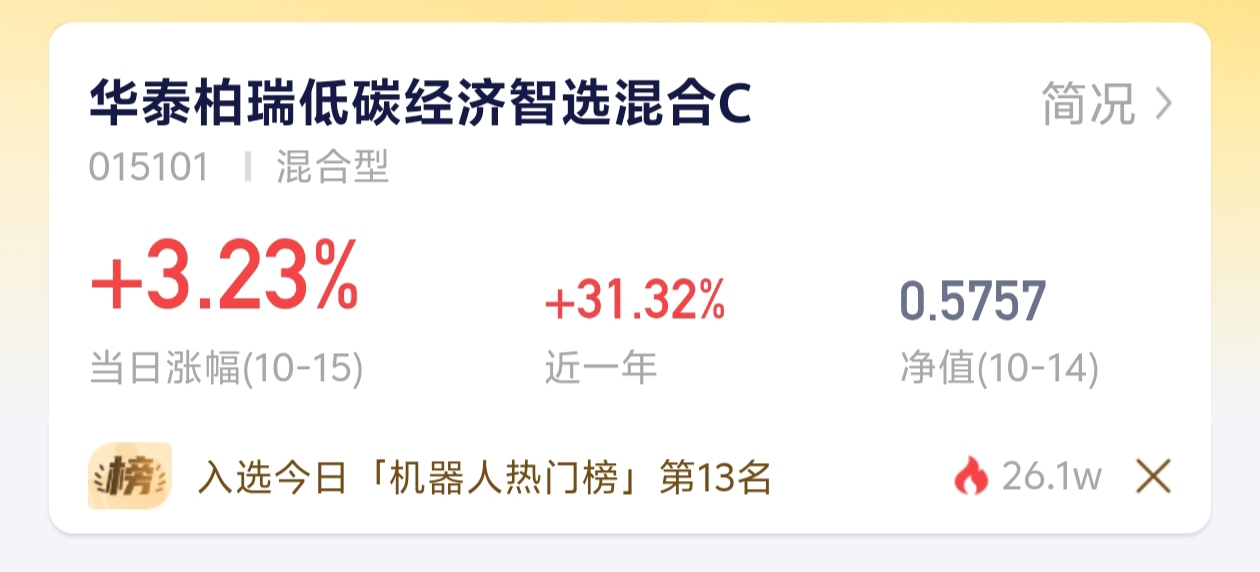 看着机器人概念爆发,$华泰柏瑞低碳经济智选混合C$ 今天估值也涨了3个点,科技与环保结合的魅力正在显现。