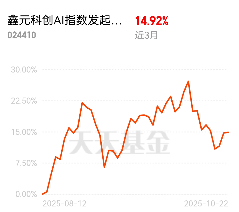早盘三大指数往下走,鑫元科创AI指数发起式C反倒逆势发力,昨晚涨0.14%。这只