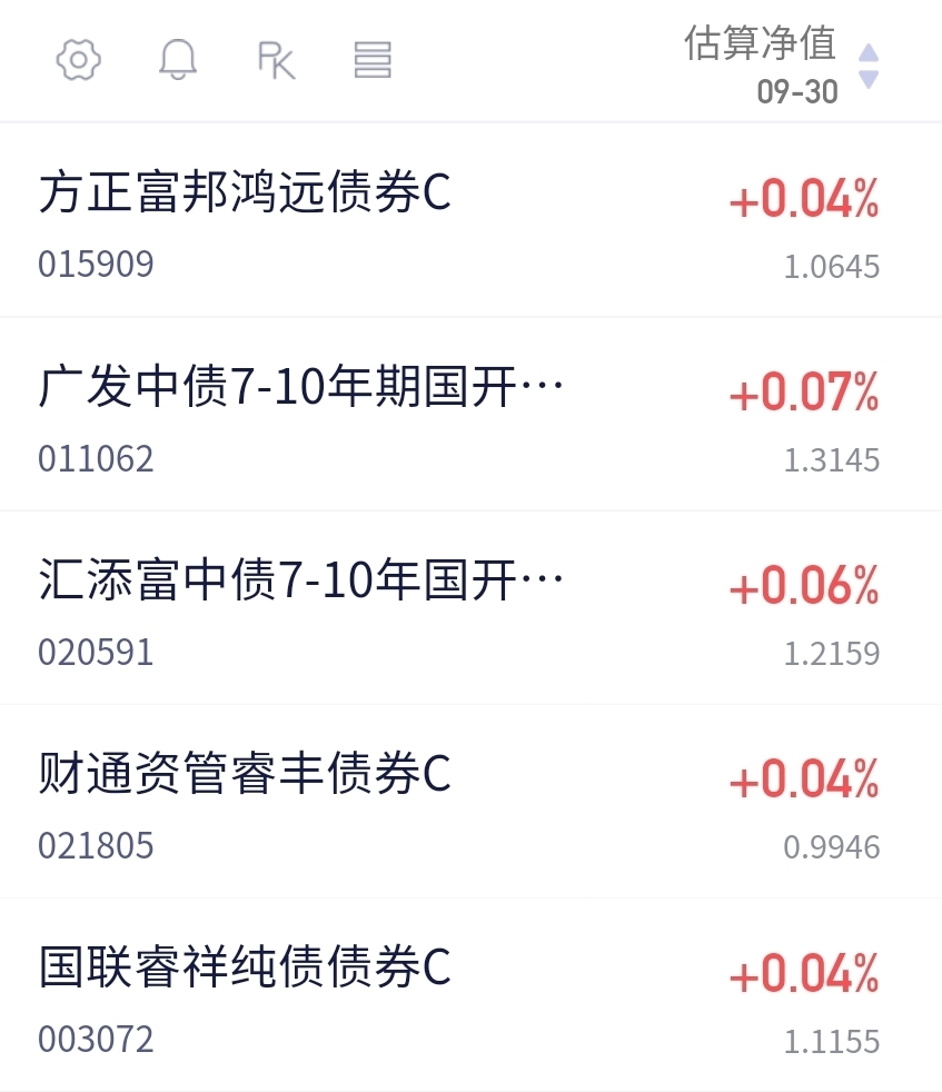 多头牛啊,直接给干红了!看下市场表现,盘面显示:长久期利率债领涨,10年期红1.5BP、超长红1.6BP,信用债也是红多绿少,产业债今天收大蛋。来看看热门产品抱蛋情况,预计今天方正鸿远30-35蛋,久期高真的回血就会很快,而且也非常适合抄底,赚的就是要比别的基多。7-10年13-18蛋,0-5年的话10-13蛋吧。目前看债市经过调整后,我觉得今天债市应该能稳住了!$广发中债7-10年国开债指数E$ 预记可以收7个蛋,也还不错#分享国庆见闻,晒收益,瓜分好礼!#