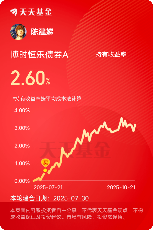 昨天债市晴天,信用债和利率债都上涨了,$博时恒乐债券A$ 昨天收了34个蛋,年收益率已经达到8.58%。最看好的就是它“债券打底+权益增强”的策略,最近的行情里,这个策略直接爆发出了超强的战斗力。近期央行货币政策的增量预期,10月20日有分析指出四季度不仅有降息空间,重启购债的条件也成熟了。这只基金的债券仓位里,利率债占比相当高,尤其是 24特国01、24特国05这类超长期特别国债,在“资产荒”背景下流动性溢价特别高,一旦央行重启购债,这类资产的价格肯定还得涨。当然更惊喜的是它的权益仓,基金经理太会选了,前十大重仓里有宁德时代、兆易创新这些消费电子和新能源股,最近行业反弹,这些个股涨幅都很可观,其权益仓正好吃到了这波红利,真正做到了“债券稳赚,权益多赚”。而且它的风险控制做得特别好,基金经理会灵活调整久期,去年波动期把久期缩短避险,今年又拉到3.2年抓收益。现在净值都涨到 1.2060了,持有体验全程在线,既保障了投资的稳健还能赚点超额收益!#指数操盘手集结令# #晒收益#