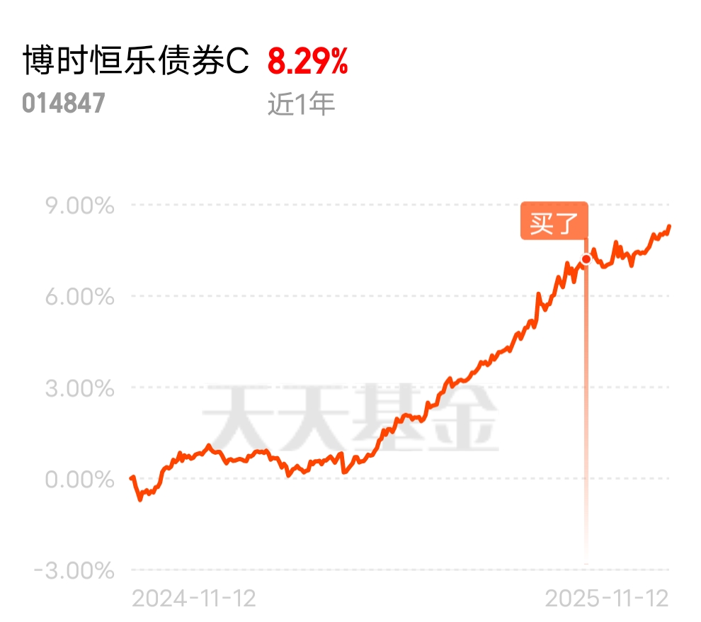 昨天债市行情有所好转,$博时恒乐债券C$ 直接收了20多个蛋,近六个月累计收蛋600多。还惊喜的发现10月底分红了,我多了三十多块进账。现在申购限额也大幅放宽了,从1万跳到500万,这对基金的流动性肯定是好事,感觉前景更稳了。10月制造业PMI降至49.0%,经济复苏动能偏弱,这种情况下债市利率上行压力减小,对于债券基金来说是重大利好。而且华泰证券、华源证券等多家机构都预判四季度债市反弹窗口期延续,10年期国债收益率有望重回1.65%左右,这对于博时恒乐这以债券为核心的基金来说,无疑是锦上添花。而且基金经理会根据市场变化灵活调整久期,比如之前资金面收紧时缩短久期,利率企稳后又适度拉长,这种“防守反击”策略让基金在债市波动中始终保持稳健,票息收入稳定,为收益提供了坚实基础。其权益部分的表现更是超出预期,重点布局了高股息红利股和金融板块,像能源、公用事业领域的红利股,不仅分红稳定,而且在市场波动时抗跌性强,而金融板块近期受益于政策利好,表现也很亮眼。基金还配置了国泰中证全指证券公司ETF来对冲风险,进一步提升了权益部分的稳健性。#段永平:投资茅台不需要太看宏观环境#