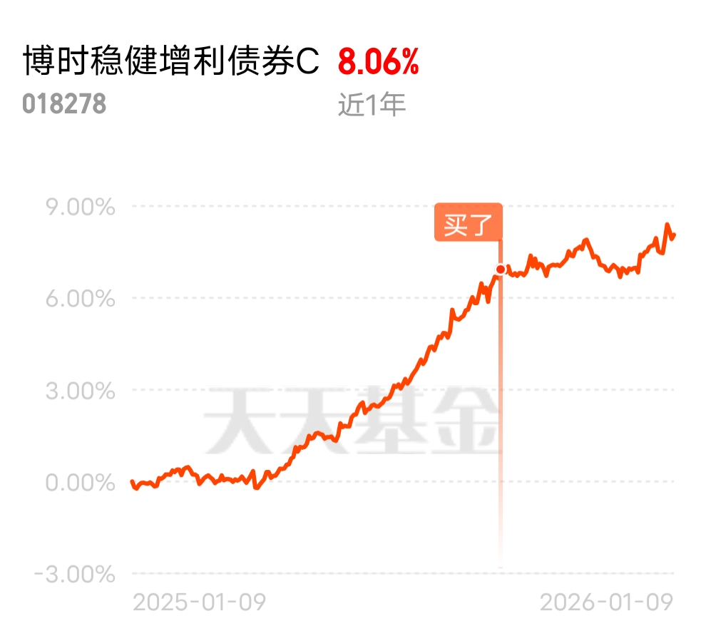这波债市股市都还行,混债两头都能赚,表现给力!$博时稳健增利债券C$ 主投债券求稳,辅以权益增强收益,近一周轻松收蛋55个,近一年收益率稳超8%,持续收益能力很在线。近期美联储降息预期升温,市场普遍预期2026年美联储将降息4次,每次25BP,随着降息预期升温,美债收益率持续下行,带动全球利率中枢下移。这对国内债市来说是重大利好,一方面能减轻国内债市利率上行的压力,另一方面也会提升人民币债券的吸引力,吸引跨境资金流入。而且从国内宏观环境来看,为了配合稳增长政策,央行大概率会维持流动性充裕的状态,这也为债基的债券部分提供了坚实的支撑。而且其权益仓位近期表现更是亮眼,重点布局了周期板块的紫金矿业,近期周期板块受益于全球流动性宽松和供需结构改善,表现十分强势。紫金矿业作为“金+铜”双轮驱动的龙头企业,2025年金价创历史新高。2026年1月以来,紫金矿业被10家券商推荐,成为周期板块的“人气王”,股价稳步走高,为基金贡献了可观的超额收益。长期来看,随着全球经济的逐步复苏,新能源、基建等领域对铜、金等大宗商品的需求会持续增长,加上紫金矿业的产能持续释放,长期成长确定性高,这基布局这类标的,既保证了短期收益,也锁定了长期红利。#暖阳创作计划#