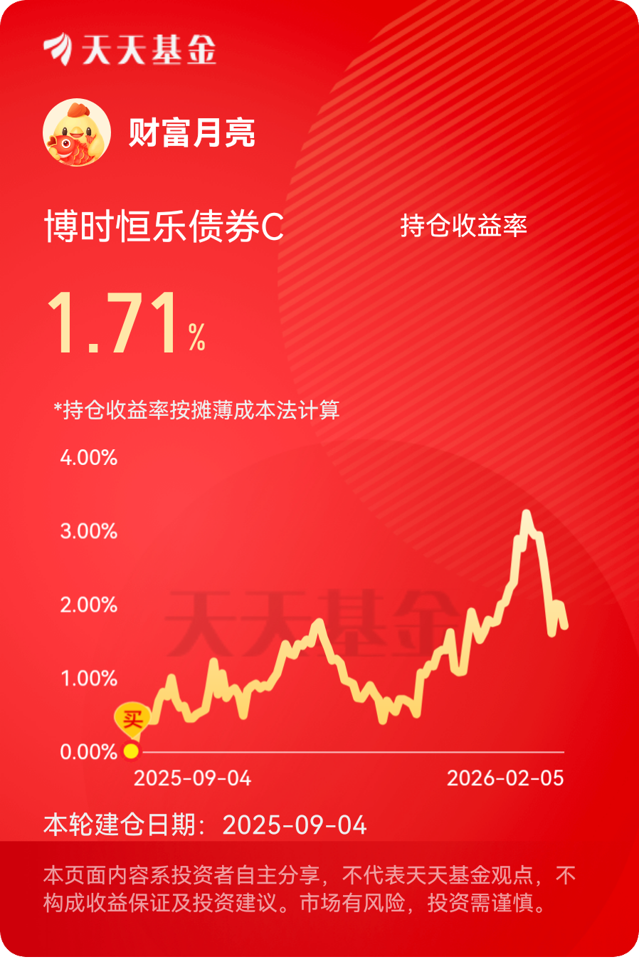 最近股市分化明显;债市却缓步企稳,情绪慢慢起来了。节前求稳为主,低波固收+是个务实的选择。$博时恒乐债券C$ 债券求稳,权益增强,近一年收益超7.5%,这“先求稳,再求盈”的思路挺对路的。最近债市整体环境不错,2月份利率债胜率占优,虽然处于震荡格局,但结构性机会很多,博时恒乐的债券部分主要配置中短端利率债和高评级信用债,精准把握了当下的结构性机会,净值稳步上涨,近6个月涨幅3.19%,在同类债基中表现也是佼佼者,关键波动还小,拿着很安心。更让人惊喜的是它的权益仓位,占比虽然不高,但选股眼光太绝了。最近发力的券商股,它直接布局了中信证券和华泰证券,这两只券商股最近的表现都很亮眼。中信证券作为券商龙头,最近的表现可圈可点,随着资本市场活跃度提升,券商的经纪业务、投行业务都有望迎来增长,而且它的估值不算高,后续上涨空间不小。华泰证券最近也稳步上涨,而且它在财富管理领域布局深远,长期潜力很大。再加上万华化学这类化工龙头,业绩稳定,估值合理,最近随着化工产品价格回暖,也有不错的表现。风浪越大鱼越贵,这波回调正是布局好时机。#马斯克密访中国光伏链?上市公司密集回应# #晒收益#