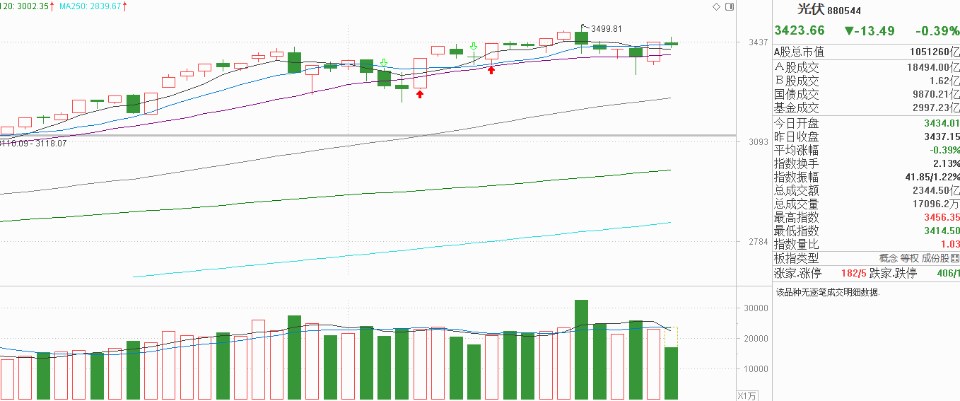 家人们,光伏昨天可真给面子!中阳反弹收复20天线,力度比9月11号还要大,当然是资金流入的信号。今天光伏在昨天价格上方窄幅震荡,并未出现持续走高的表现,未能形成连续的资金流入,不能看成是向上突破的信号。从细分赛道看,光伏产业、风电、储能、机器人都是上涨的,市场合力应该是存在,就像昨天午盘时是一样的,这种情况下不排除下午资金继续发力实现第二天中阳反弹,如果出现持续的资金流入,我认为光伏行业长达一个月的横盘周期有可能结束并展开向上突破的行情,现在还在震荡平台位置就应该继续看好。9月5号、9月11号光伏虽然有资金流入,但持续性是不足的,导致横盘的形成,如果本次光伏真能走好,当然就是转折点了,如果光伏今天无法中阳反弹,那就继续看横向震荡,等待各细分赛道回踩5天线的机会。