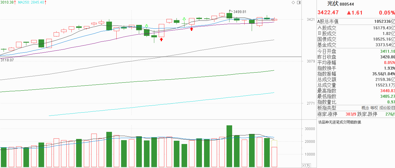 家人们,咱们今天得好好聊聊让人又爱又恨的光伏!昨天冲高回落小阴调整,今天低开在10天线后探底回升,连续两天波动还在周三中阳线上方,说明多空平衡谁也不占优,也属于自9月5号大阳线上方的横向震荡。对于光伏行业来说,细分赛道太多,必须出现市场合力才能继续走高。今天风电表现很强带动储能回升,光伏产业与机器人窄幅震荡没有表态,我认为是市场依然分歧的表现,今天出现突破向上的概率很低。由于光伏周三中阳反弹后连续两天无法形成合力上行,资金并不是持续流入,追涨风电我认为是不合适的,说不定下周又轮动到其它赛道。对于这种下有支撑,又没有打算向上突破的光伏来说,由于指数还在走强,我认为可以在回调的时候逢低看好,毕竟下方承接力强,而主力随时都有可能启动新周期。