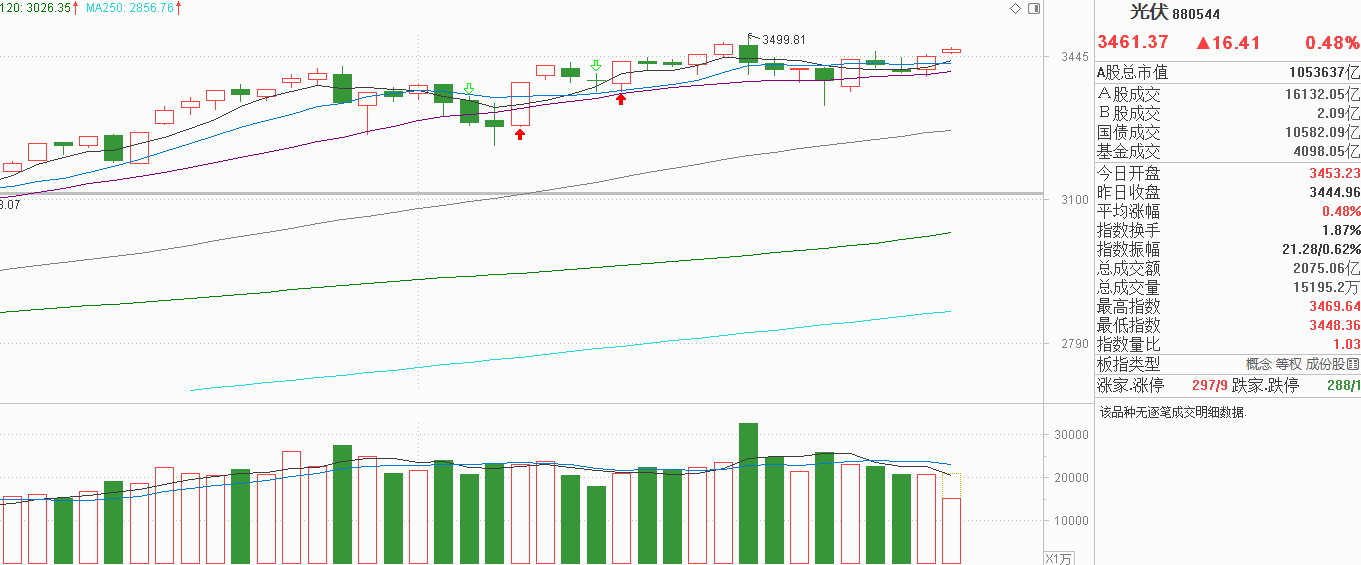 家人们,注意了!光伏昨天干啥了?探底20天线后回升小阳反弹收复5天线,出现这种情况当然是这些均线相距都很近,并不是说光伏出现很大力度的反弹启动上涨趋势。事实上光伏与新能源车一样都是基于一根大阳线后的横向震荡,光伏出现得更早是在9月5号大阳线。很明显9月行情就是在5号阳线上方波动。即使今天光伏小阳反弹,力度依然无法与5号大阳线相比,要让整个板块出现上行我认为不太容易,市场合力还是必须的观察点。今天细分赛道光伏产业小涨,机器人是小跌,其余风格跟着指数上行,没有形成明确的市场合力,感觉光伏要突破9月18号高点是较困难的,不过节日期间消息面是比较多的,不排除因为消息刺激导致节后市场出现合力推动光伏脱离当前横盘震荡平台。当然,如果有利空估计还要再回探5号大阳线的支撑。由于光伏整体波动不大,我觉得可以偏积极一些。