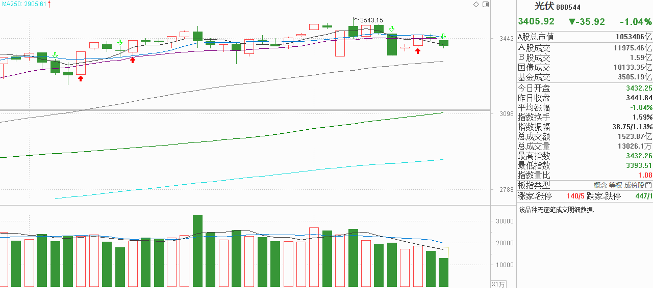都瞅瞅光伏啊!昨天窄幅震荡收了一个十字星,20天线看起来是支撑,但别忘记了,光伏自9月5号大阳线后一直横向震荡,别说20天线了,5天线、10天线也是走平的,没支撑!我认为光伏近期有意义的观察点是上周五的大阴调整与本周二的中阳反弹,基本从那里来往那里去,多空是平衡的。今天光伏低开小阴调整后回升,走势与指数的分时波动也很像,而市场连续五天缩量,观望的资金非常多,细分赛道方向,光伏产业今天基本没有波动,机器人、风电、储能都有走弱,整体上是偏空的,低迷的投资气氛让光伏也没有抵抗力量,今天守住5天线继续震荡我认为是中规中矩的表现。我也不知道主力什么时候会出现资金的流入,但9月至今的箱体没破,横向震荡总不能说它是破位,市场都这样了,冰点阶段耐心等待市场回暖可能是更好的选择。