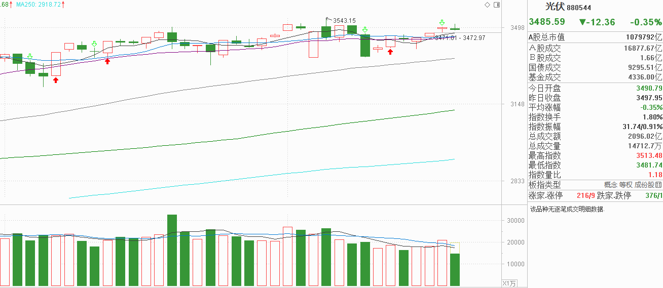 我勒个去!各位跟踪光伏的朋友,昨天高开探底后回升,上涨力度并不大,主要原因是没有市场合力。今天的情况比昨天好,按住低下影线更短一些,阳线实体也大一点。从细分赛道看,光伏产业、机器人、储能、风电还是没出力的状态,多空平衡互有震荡,资金看起来并没有重点在流入某一方向。今天指数表现相对偏暖,光伏出现上涨更跟风上行为主,当下光伏行业依然是箱体震荡阶段,高点出现在10月14号目前看起来没有突破的准备,低点是9月5号大阳线支撑区域,我发现非极端情况也很难回踩到位。当下均线基本粘合,资金没有流入,更多应该是无序波动。这种情况我会先观望,如果突然出现资金流入的合力,我会踊着主力一起看好,但如果主力没有流入,又没有走弱的信号,只能继续等待机会了。