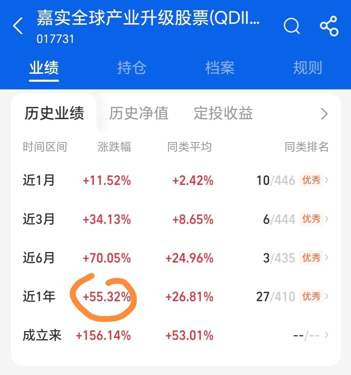 美股市场太强了,科技板块继续领涨。英伟达创新高,消息面,英伟达宣布未来芯片订单已达5000亿美元,推动股价上涨。嘉实全球产业升级股票(QDII)C$嘉实全球产业升级股票(Q DII)C$,$嘉实全球产业升级股票发起式(QDII)C$ 近一年收益55.32%,近一月11.5 2%,表现稳定。持仓包含英伟达、微软、谷歌等全球科技龙头,业绩同类排名靠前,非常棒。