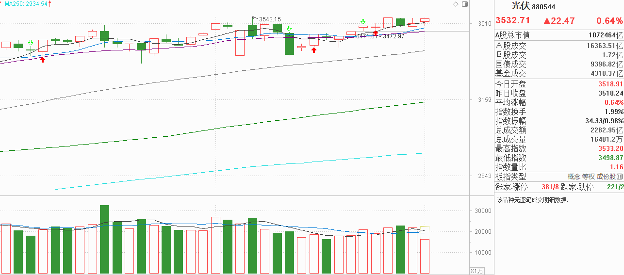 哎呦喂!各位关注光伏的老铁们,上周五一度小阳反弹把上周四的阴线反包了,但没有维持到收盘就冲高回落了,上影线比较明显,而10月14号光伏高开高走冲高回落留下非常长的上影线,位置区间与当下很近,上周五的上影线我认为是此前抛压的余波。由于还是震荡市,发现阻力当然要先探找支撑再进攻,今天光伏在5天线附近窄幅震荡,低点比上周五的低点要高,我认为市场抛压并不大,从细分赛道看,今天就机器人出现回调,光伏产业、储能、风电都是弱震荡,抛压真的不大,如果机器人探底回升,其余赛道也有资金继续流入,光伏要创新高是有概率的。如果今天没资金回流,这种只有一个细分回调,其余都不跟随的情况,也不会导致光伏再次走弱,现在维持在5天线附近波动是合理的,也没有破坏光伏想向上突破的形态。接下来光伏怎么走,就交给主力选方向了。