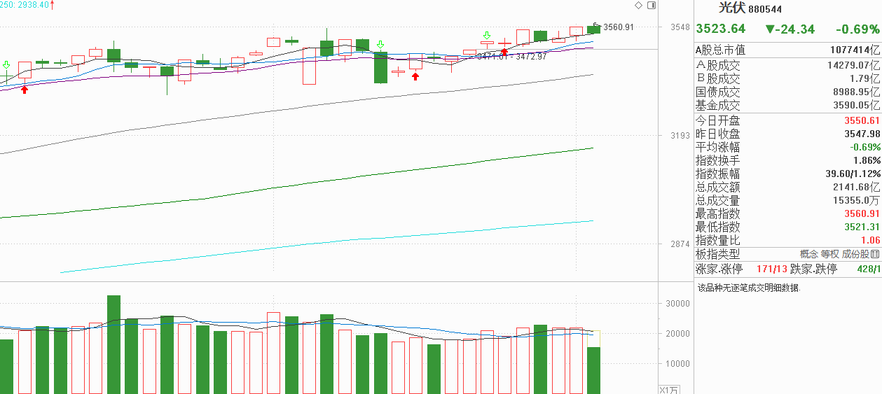 各位跟踪光伏的朋友们,昨天是不是看到希望了?探底回升小阳反弹接近10月14号的高点,很明显只要今天光伏出现震荡,就能向上突破创反弹新高。今天光伏高开冲高后在5天线上方出现震荡,给我的感觉明显不是突破的表现,只是震荡上行而已。从细分赛道看,光伏产业、储能、风电都是调整,机器人昨天已经在回调,今天的回调力度在加大,整体感觉资金都在流出,可光伏行业的市场重心居然是上行的,这就有点超纲了,只能说光伏行业里可能出现一些新的走强赛道,主力为了光伏走高实在是用心了,能在细分赛道都在回调的情况下继续走强。如果看待这种割裂的体感?我认为还是结构化行情,如果所在赛道真的在走弱,就别管光伏行业是如何继续上行的,发现阻力发现资金流出就要跟着主力一起走,不要等待全线走弱后再反应过来。