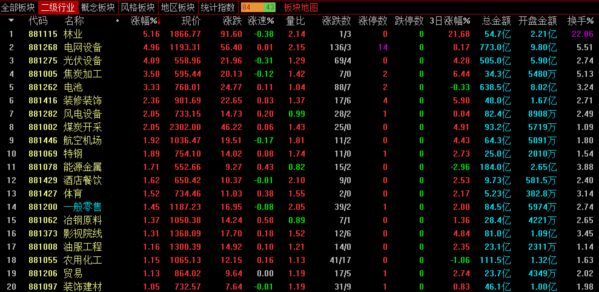 不过开盘后沪指走了个低开高走,20 日均线的支撑又起效了缩量逆转。只是市场还是缩量状态,这意味着接下来大概率还要继续震荡。现在我们看看板块趋势: