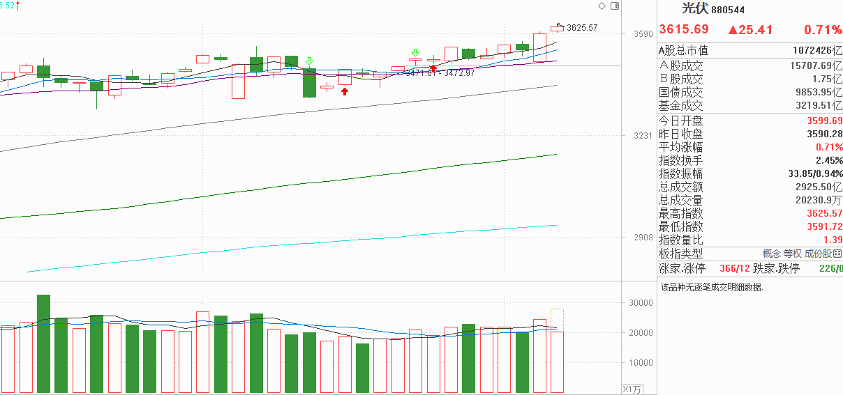光伏的朋友们,昨天你们是不是被吓坏了?大幅低开在20天线后中阳反弹走高并创出新高,阳线力度与9月5号、10月13号相当,是一个比较明显的资金流入信号,今天高开高走继续向上走强,我觉得主力还在积极做多,因为从细分赛道看,光伏产业、储能、风电、甚至是机器人全线走好,都有一定的涨幅,这就是平时谈的市场合力,只不过昨天细分赛道分歧时阳线力度这么大,今天有市场合力的时候阳线力度反弹弱很多,有点美中不足。不管怎样,既然市场选择了向上突破而且筹码比较稳,这就是一个积极的信号。在众多科技题材中,光伏行业是第一个主动创10月新高的品种,我认为有可能成为11月甚至12月的资金博弈方向。当然,从9月5号、10月13号中大阳线后,光伏都不是单边上行的,当前周期下追涨性价比不高,也可以等待回调时的机会。