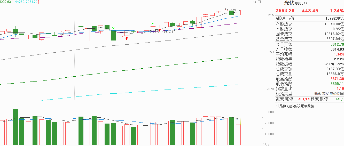 光伏的朋友们,都给我竖起耳朵听!周二五连阳创新高,昨天突然出现中阴调整击穿5天线回踩10天线,尾盘探底回升出现长下影。盘后消息多渠道辟谣盘中的小作文,今天中阳反包收复昨天的失地,无论从技术面、消息面来说都是完美的。连续5天上涨出现急跌后的回升反包很像洗盘,而消息面又有进一步的确认,原来的超买信号消失,又能继续按原有的趋势走了。从细分赛道看,光伏产业今天只是修复,机器人、风电是震荡,真正走强走猛的是储能,如果按原来的市场合力论,今天的反包只是震荡市的修正,继续向上的概率并不大。但进入11月后,光伏行业感觉不是按市场合力走的,连涨5天的阶段也只出现过一天合力,其余时间全是分歧上行,基于这个未知因素,我觉得光伏可以两手抓,如果明天真能创新高就继续看好,重新掉头向下就按震荡市箱顶策略对待,今天不做强弱的判断,等明天。